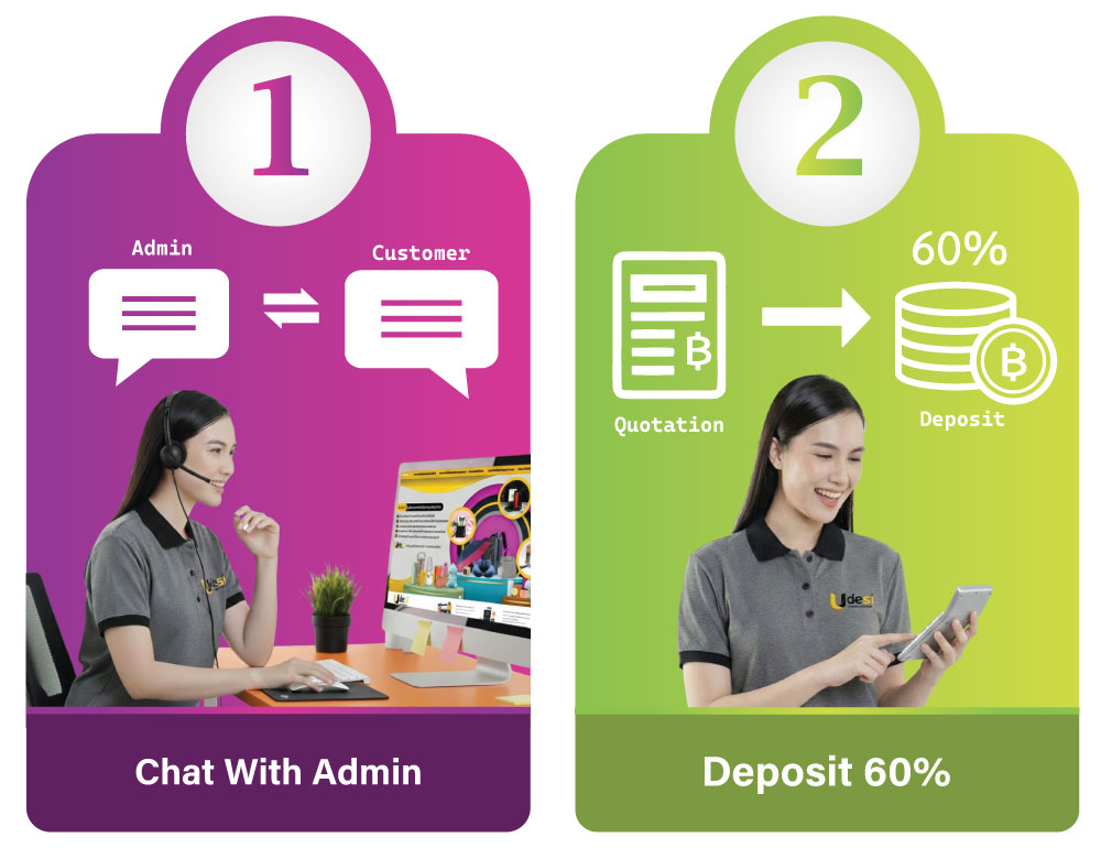 เมื่อสรุปรายละเอียดและยอดสั่งผลิตเรียบร้อย ลูกค้าชำระเงินมัดจำ 60% ของยอดบิล เพื่อยืนยันเริ่มเข้าสู่คิวงานผลิต