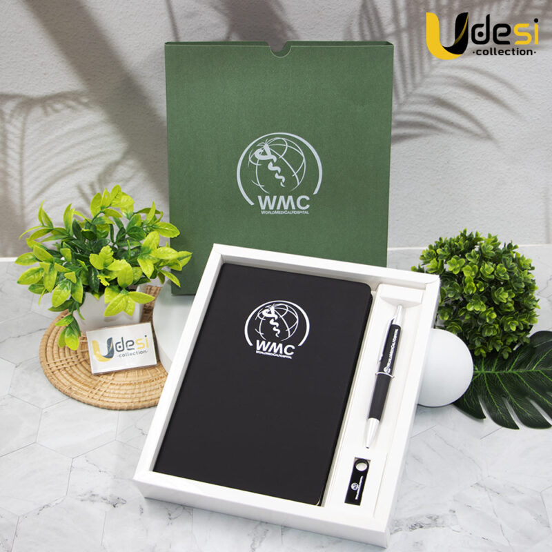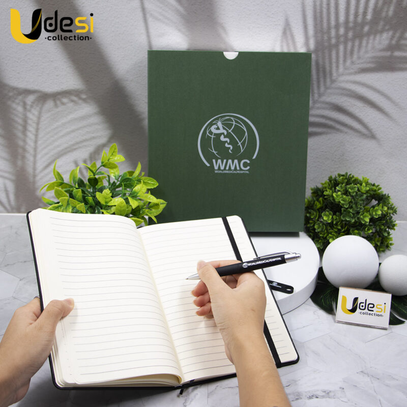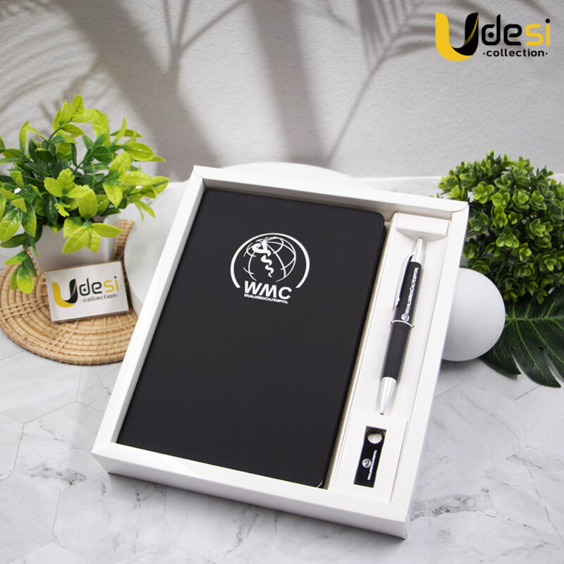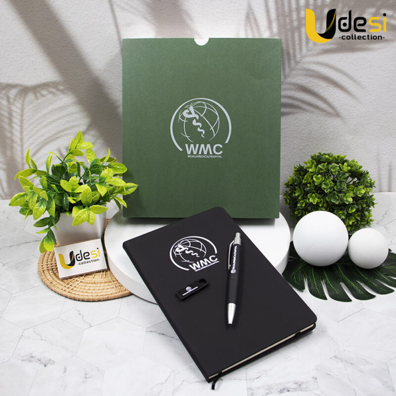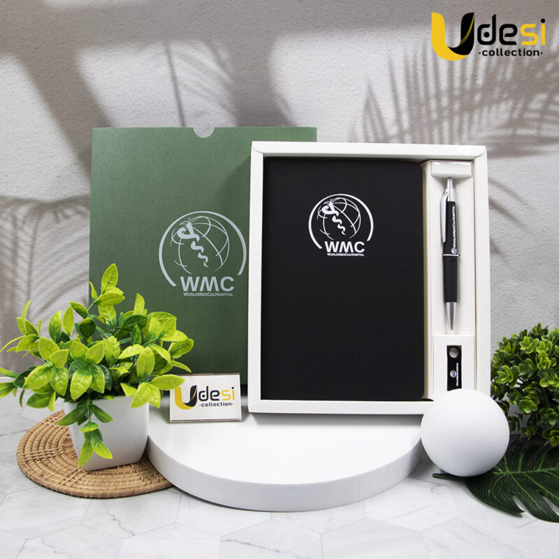 ผลงานของพรีเมี่ยม[ST000035]-Gift Set สมุดโน๊ตA5ปกแข็ง PU + ปากกาลูกลื่นแบบกด หมึกดำ 1.0 มม. + แฟลชไดร์ฟโลหะ USB2.0 ความจุ 8G (รพ.เวิล์ดเมดิคอล)