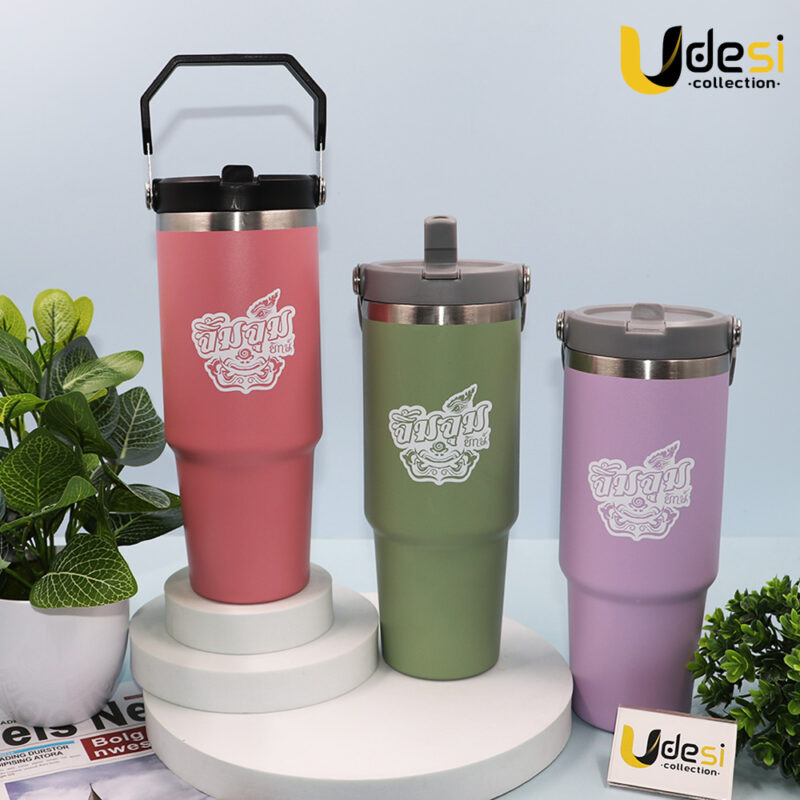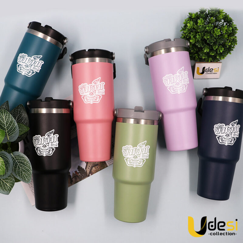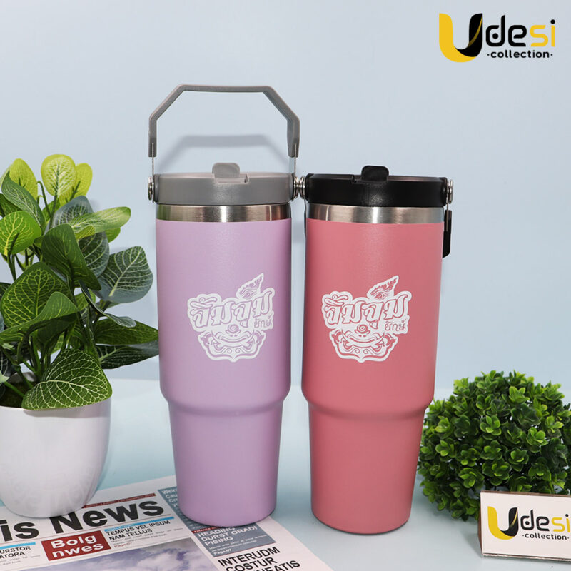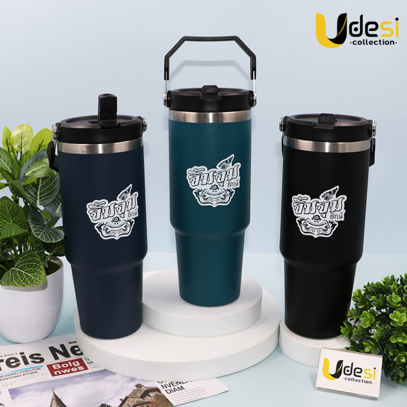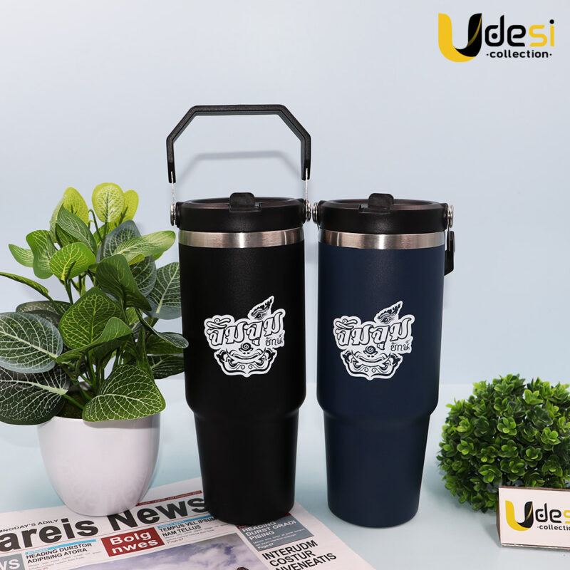 ผลงานของพรีเมี่ยม[AP000819]-แก้วเก็บอุณหภูมิสแตนเลส 304 ขนาด 30 oz. พร้อมฝาหูหิ้ว(ทรงเหลี่ยม) (บ.ครอบครัวยักษ์)